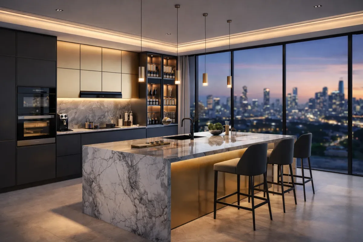 For homes overlooking golf greens and skyline views, we deliver statement kitchens with marble waterfall islands, handle-less shutters, and integrated European appliances.